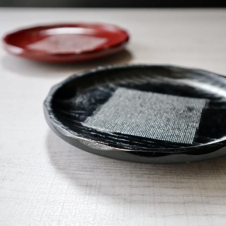 見込みに麻布が貼られ、漆塗りで仕上げてあります。ちゃわんの糸底などの摩擦に強く、デザインでありながら実用的です。